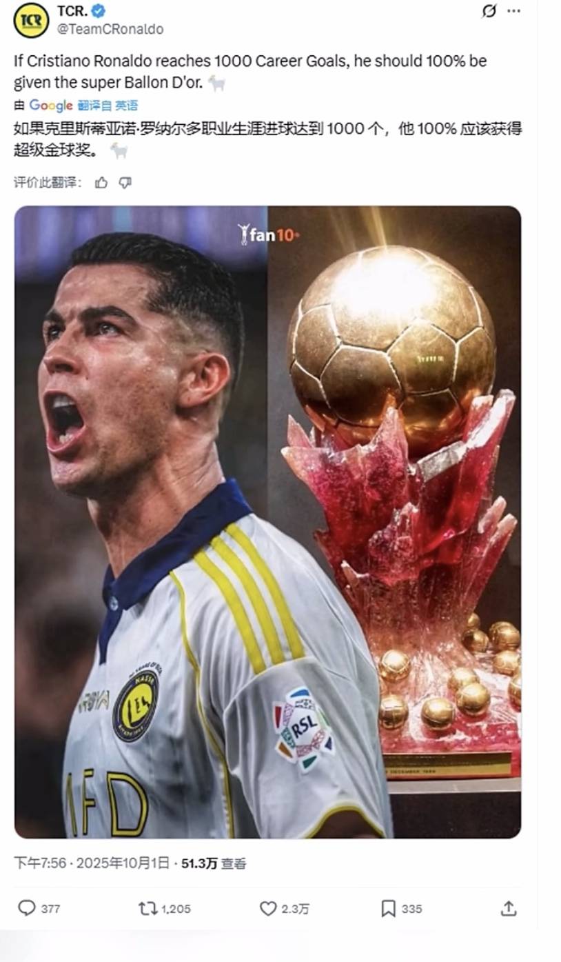 C罗粉丝跟C罗一样,一边渴望金球奖,一边还要假装看不上金球奖。比如有个国外的C罗营销号,名称叫“C罗团队”,就试图用1000个进球来觊觎基本被梅西锁定的金球奖。他这样写:如果C罗进1000个球,那他百分百会有超级金球奖。这不纯扯淡吗?哪怕只看数据,梅西也快900进球400助攻,而且他一年91进球、6个欧洲金靴、五大联赛第一射手加助攻王,这个数据不碾压C罗?而且梅西如果续约到2028年,他想进1000个球也太容易了。